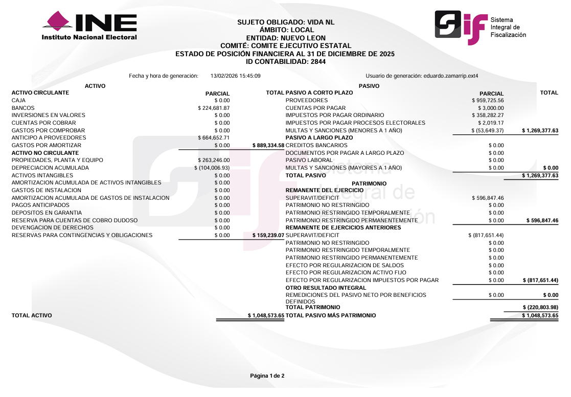 ESTADO DE POSICIÓN FINANCIERA AL 31 DE DICIEMBRE DE 2025